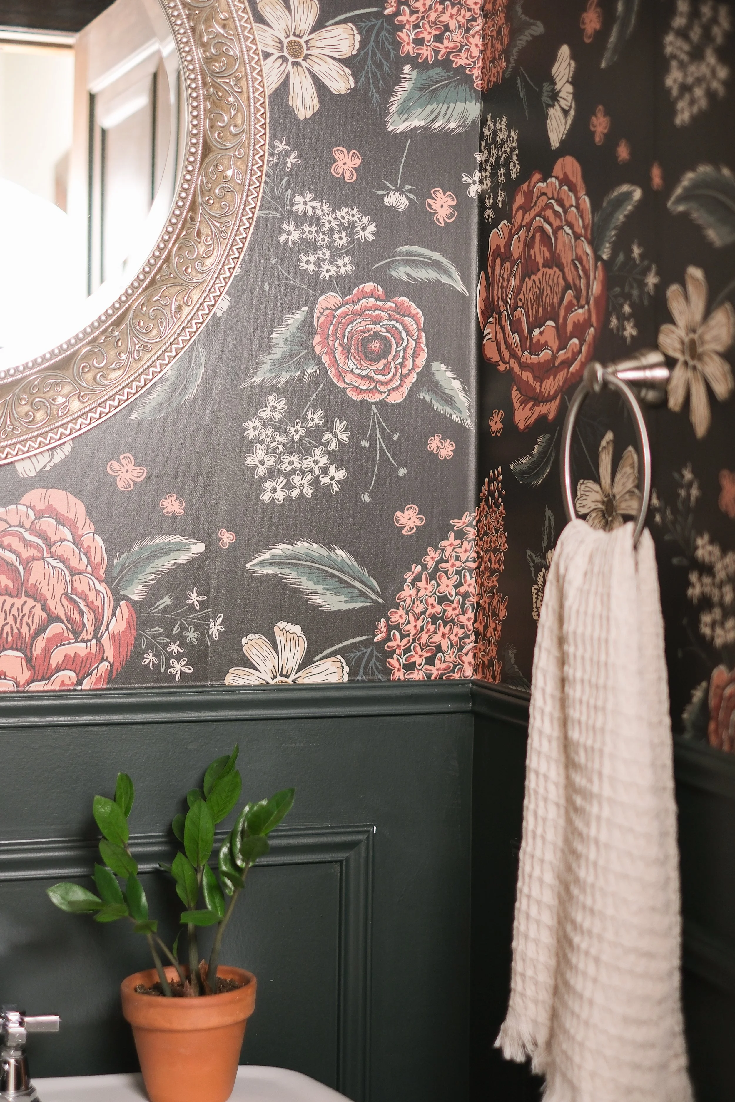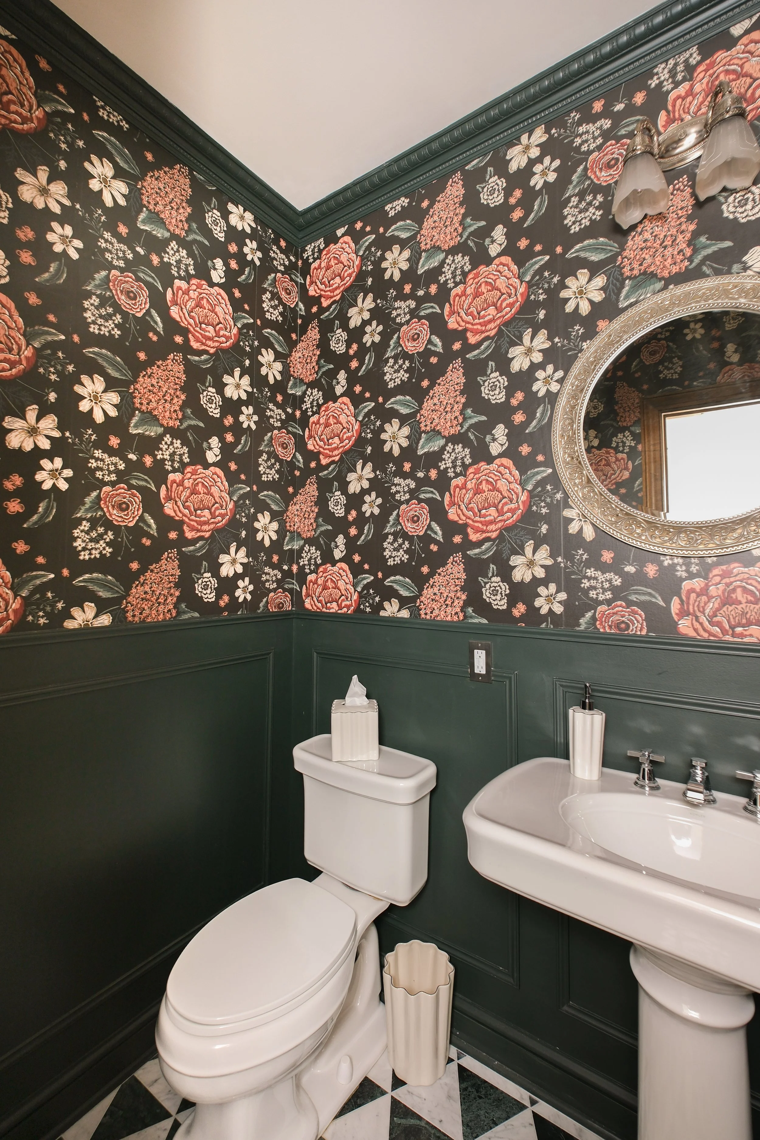 The pattern was designed with depth and movement in mind, using layered florals and a rich, moody color palette to create a sense of intimacy within the powder room.
