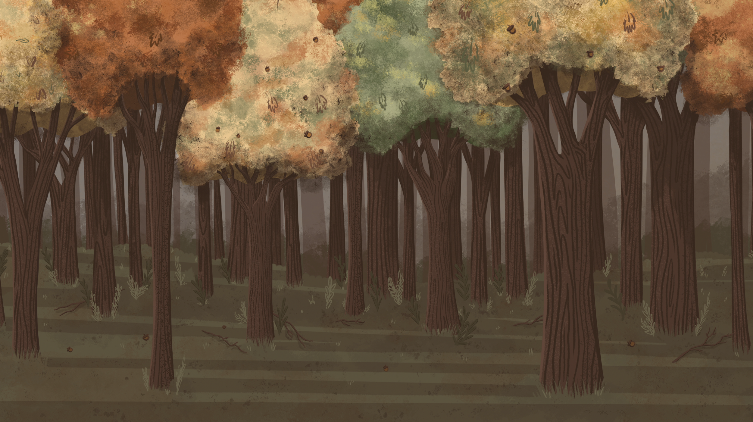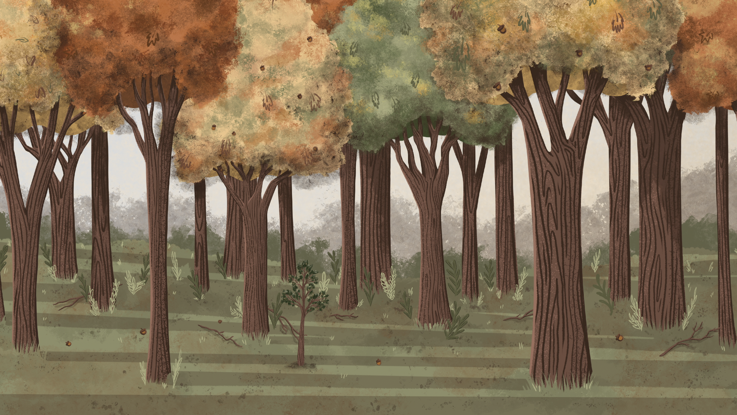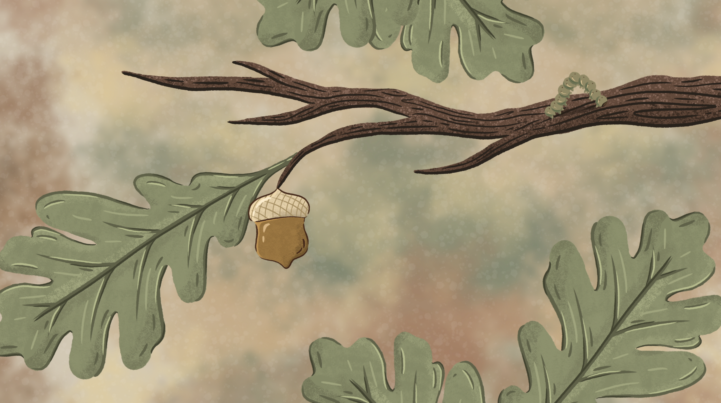 Illustrations were designed to feel approachable and informative—balancing clarity with a sense of movement and life. Elements such as trees, leaves, caterpillars, birds, and acorns were drawn digitally, then animated to demonstrate ecological processes in an intuitive way.
